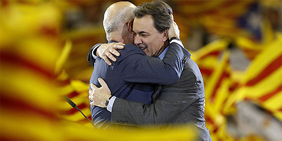 (En la foto puede verse a Durán y Lleida abrazándose con Artur Mas. Durán ha dicho una enorme gilipollez. Si se la cree es tonto del culo. Imbécil de libro. Si no se la cree, es una caradura, un mentiroso. Un demagogo, un victimista. Los dos se merecen. Se abrazan fuerte. Tal vez no se despeguen nunca.